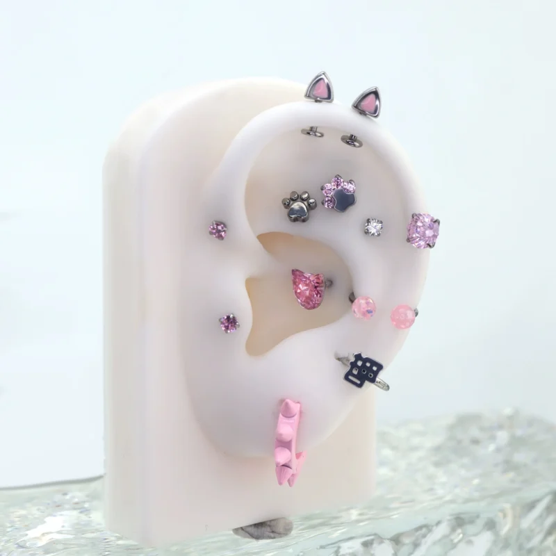 Earlobe perforations have become the most popular perforation style due to their astonishing diversity and versatility. You can easily find your own unique style, whether it's simple stud earrings, cute and shiny rings or dazzling pendants. The earlobe is the softer part of the ear, which can be stretched and adapted to large stud earrings of 16G, 18G and 20G. This wider area is perfect for trying and personalizing your unique earring style. Whether it's the simple single stud or the ever-changing layering, we guarantee that no matter what your beauty needs are, bling kitty can meet them.